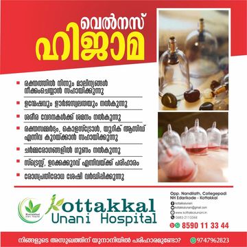 Get started on the path to health! Kottakkal Unani Hospital is one of the best unani herbal treatment centre in Kerala. The ultimate centre for hijama treatment & unani treatments. We offer special treatments for ortho neuro diseases and chronic diseases like Psoriasis, exzema and allergic disorders.